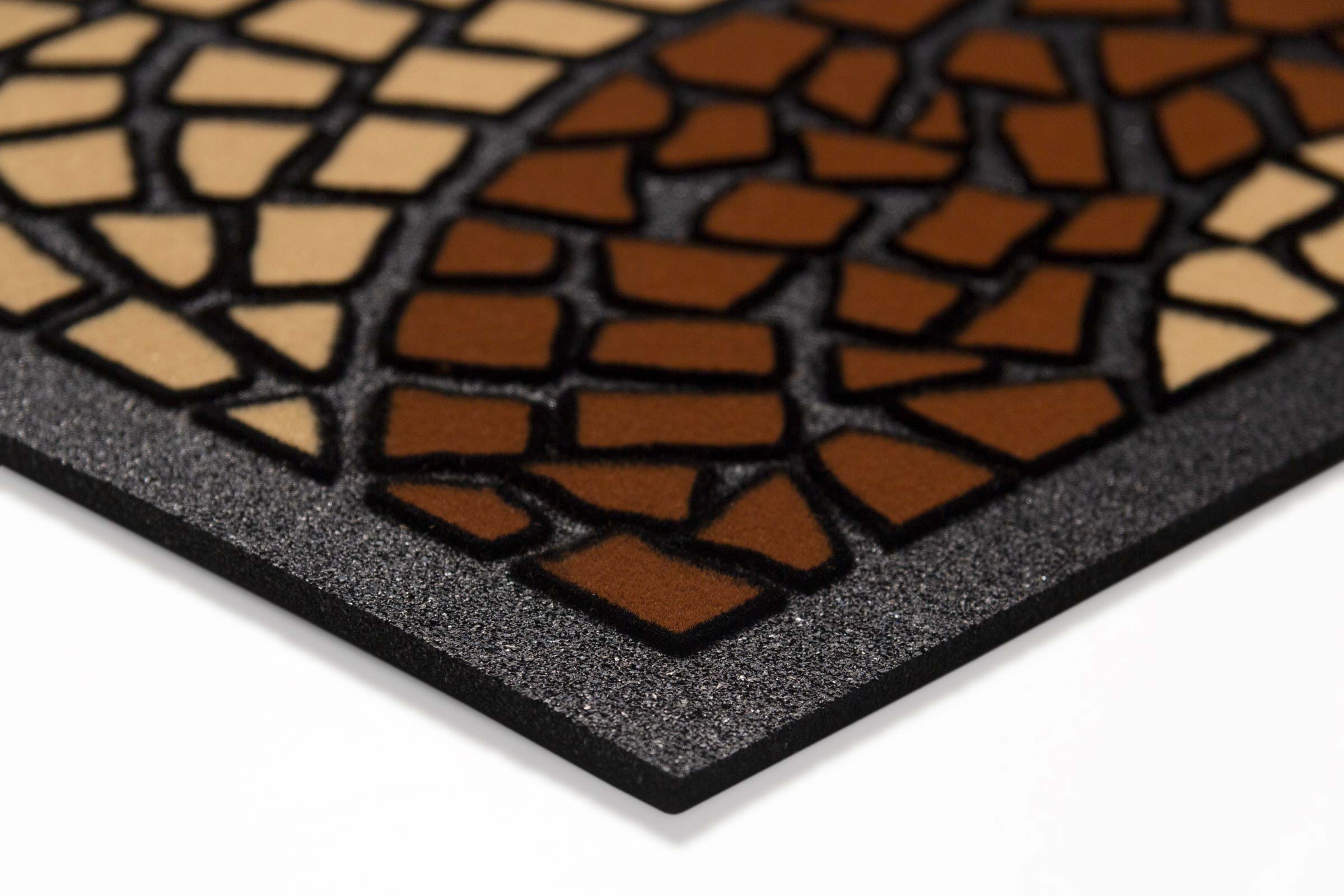 I disegni in rilievo sulla superficie pulente dello zerbino sono realizzati tramite floccatura con resistente Nylon Poliammide, dai colori durevoli e ben ancorato alla superficie.
